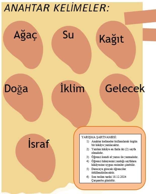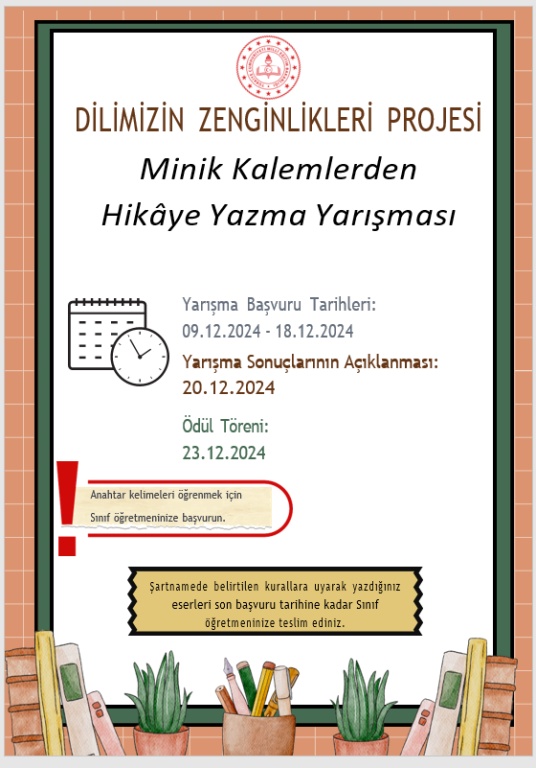 Dilimizin Zenginlikleri Projesi kapsamında öğrencilerimiz arasında kısa hikaye yazma yarışması yapılacaktır. Öğrenciler yazdıkları eserleri18/12/2024 tarihine kadar öğretmenine teslim edecektir.