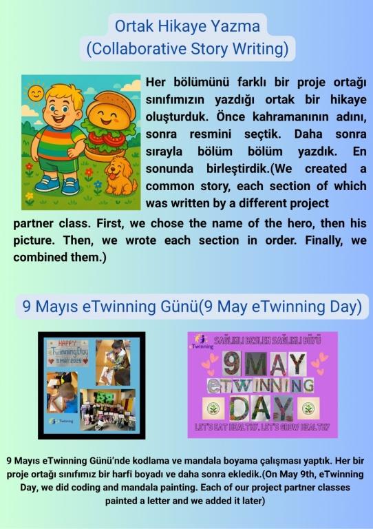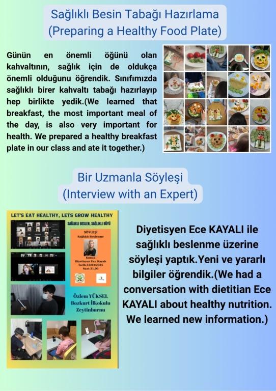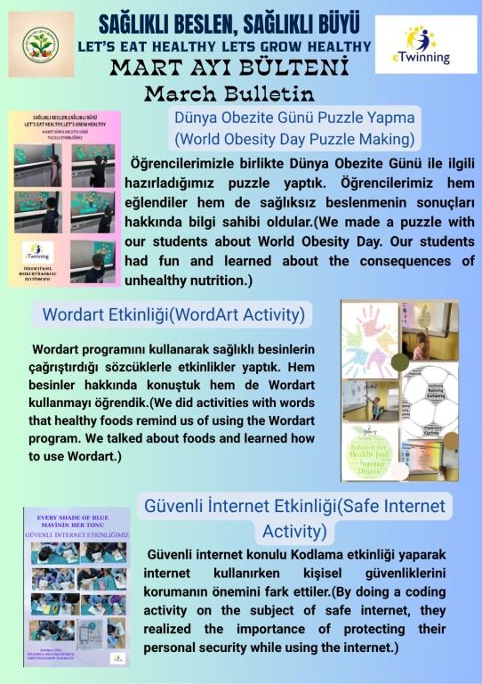 Okulumuzun 2024-2025 Eğitim-Öğretim yılında dahil olduğu eTwinning Projesi " Sağlıklı Beslen Sağlıklı Büyü" kapsamında yapılan çalışmalar 3/E Sınıf Öğretmeni Sibel DİNCEL, 2/D Sınıfı Öğretmeni Nilüfer KORKMAZ ve 3/C Sınıf Öğretmeni Oğuz ÜSTÜNTAŞ koordinatörlüğünde gerçekleştirildi.